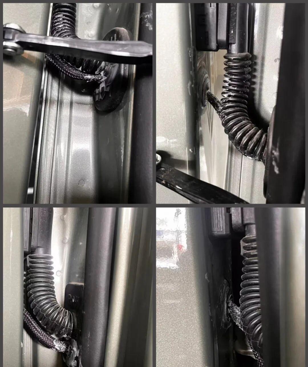 ❌ The horn wire roughly “flies” through the active area of the door hinge. And this isA “time bomb” that causes water leakage in the door, wire wear and short circuit, and will have problems in about 3 months.。