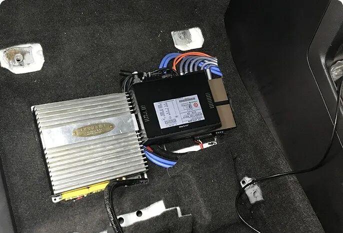The owner’s own two-channel power amplifier used to drive the mid-bass, the Biwei DSP processor as the brain of the system, and the Alpine A 09 host are centrally planned and installed together to form an efficient and tidy core equipment area.
