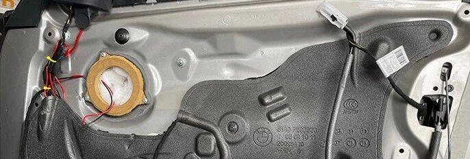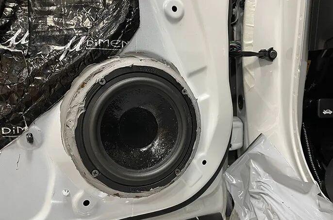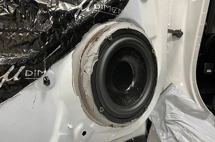 Installation of woofer unit in door. We have added a tailor-made waterproof sealing gasket to ensure that it is firmly bonded to the door panel and creates an ideal sound environment.