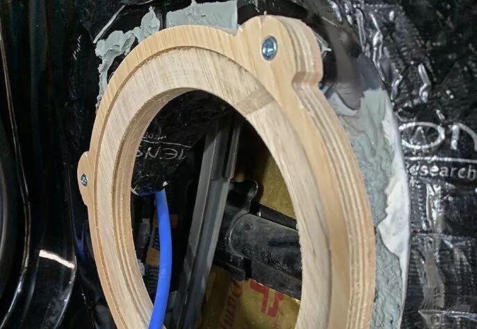 Construction first begins with the door panels. The picture shows that before the midwoofer unit is installed, the special waterproof horn gasket is firmly in place, providing a stable and sealed working environment for the speaker.