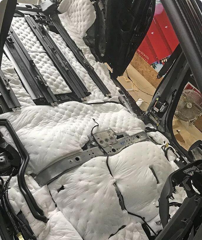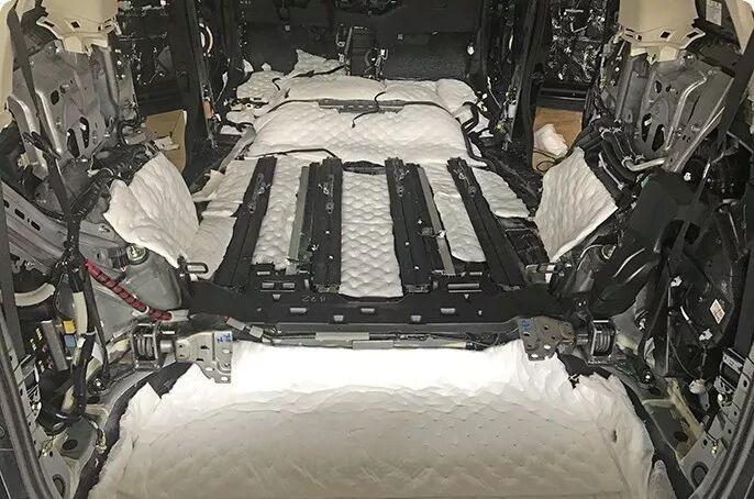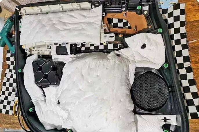 After the back of the interior parts is vibration-stopping treatment, a layer of sound-absorbing cotton is applied to further absorb high-frequency noise.