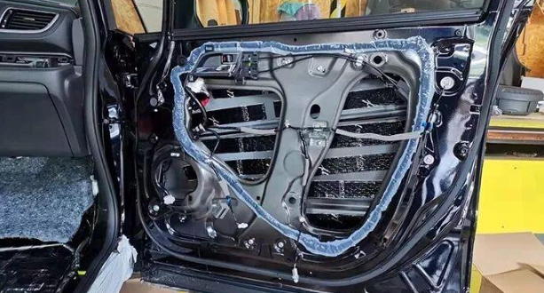 The vibration-stopping plate on the inner layer of the door is bonded to complete the effect, laying the foundation for subsequent sealing and sound absorption treatment.