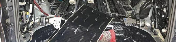 Sound insulation construction in the chassis area is underway: first, the first layer of high-quality vibration-stopping plates is laid to effectively suppress sheet metal resonance.