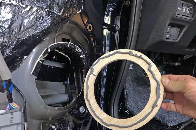 So far, the main construction of the whole vehicle systematic sound insulation and noise reduction project has been basically completed. Next, we will get into the core link of professional car audio modification. The installation process of speakers, the quality of auxiliary materials used and the professionalism of modification methods directly determine the service life, stability and final sound quality performance of the entire sound system. The first step of construction is to install a tailor-made high-density waterproof horn gasket for the front soundstage speaker.