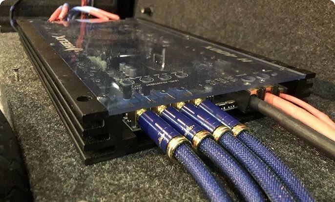 The effect of the upgraded Biwei DSP audio processor and a complete set of Barney wires after the installation and arrangement in the car are completed. The layout is neat and the wiring is standardized, which lays the foundation for high-fidelity transmission of signals.