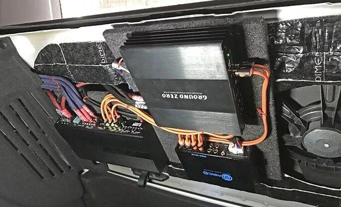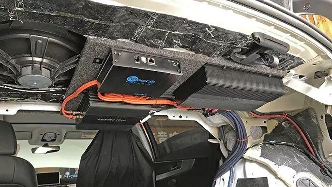 Two power amplifiers and DSP audio processor are centrally installed on the side wall or baffle of the trunk. First, it is necessary to customize a high-strength fixed back plate (wooden board or other material) according to the installation space, and then install all equipment on this back plate in an orderly manner to achieve a clean, stable and easy-to-maintain layout.