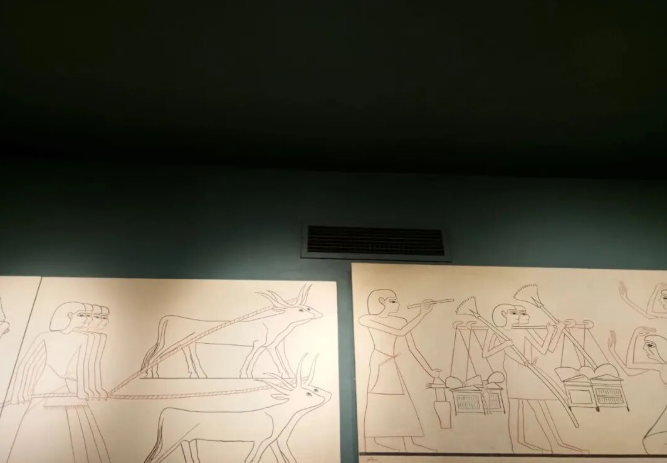 The murals depicting the mummy making process on the wall appear white under the light, and the contents are difficult to understand.