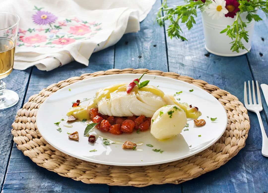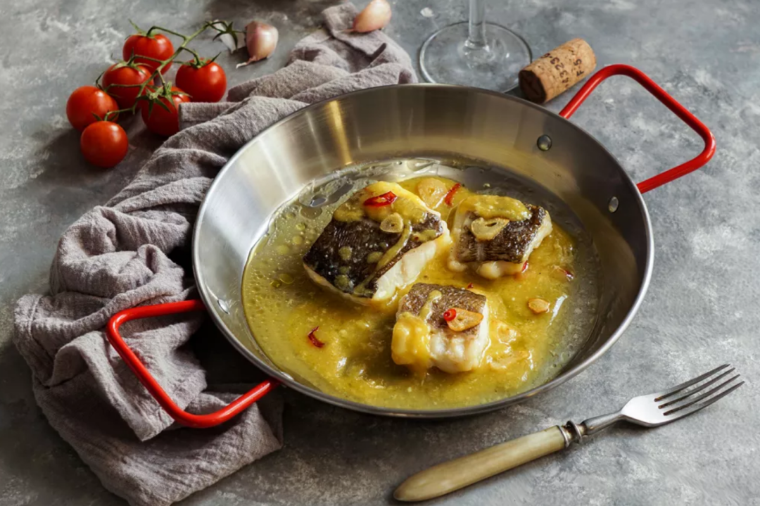 Pilpier cod is a Basque specialty. Cod is cooked with olive oil, garlic and peppers at low temperature to form a rich emulsified sauce.