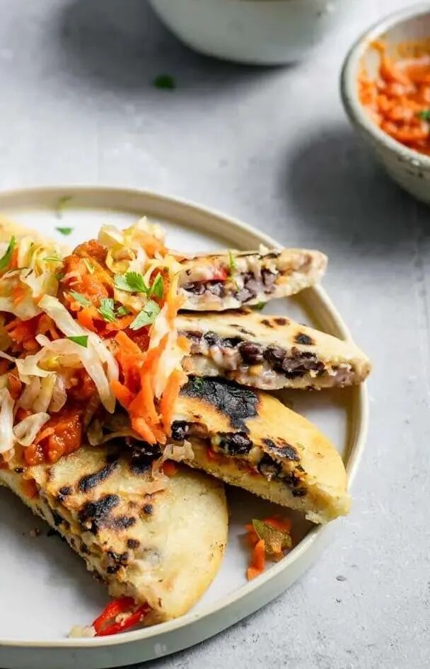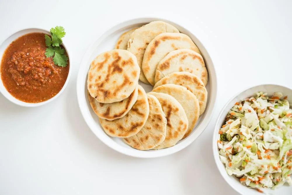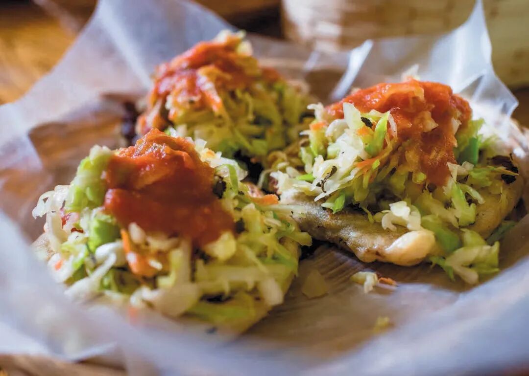 Pusha is a traditional Salvadoran corn tortilla filled with cheese, mashed beans or meat and served with spicy cabbage.