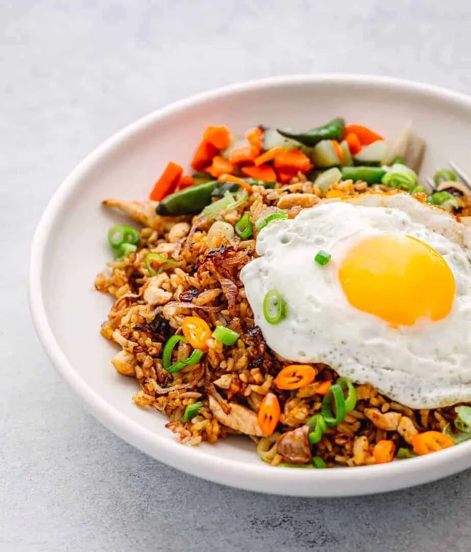 Indonesian fried rice is seasoned with spices, often added with meat and vegetables, and accompanied by fried eggs, fried onions and other side dishes. It is a representative street food in Southeast Asia.