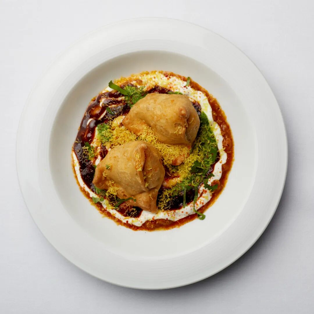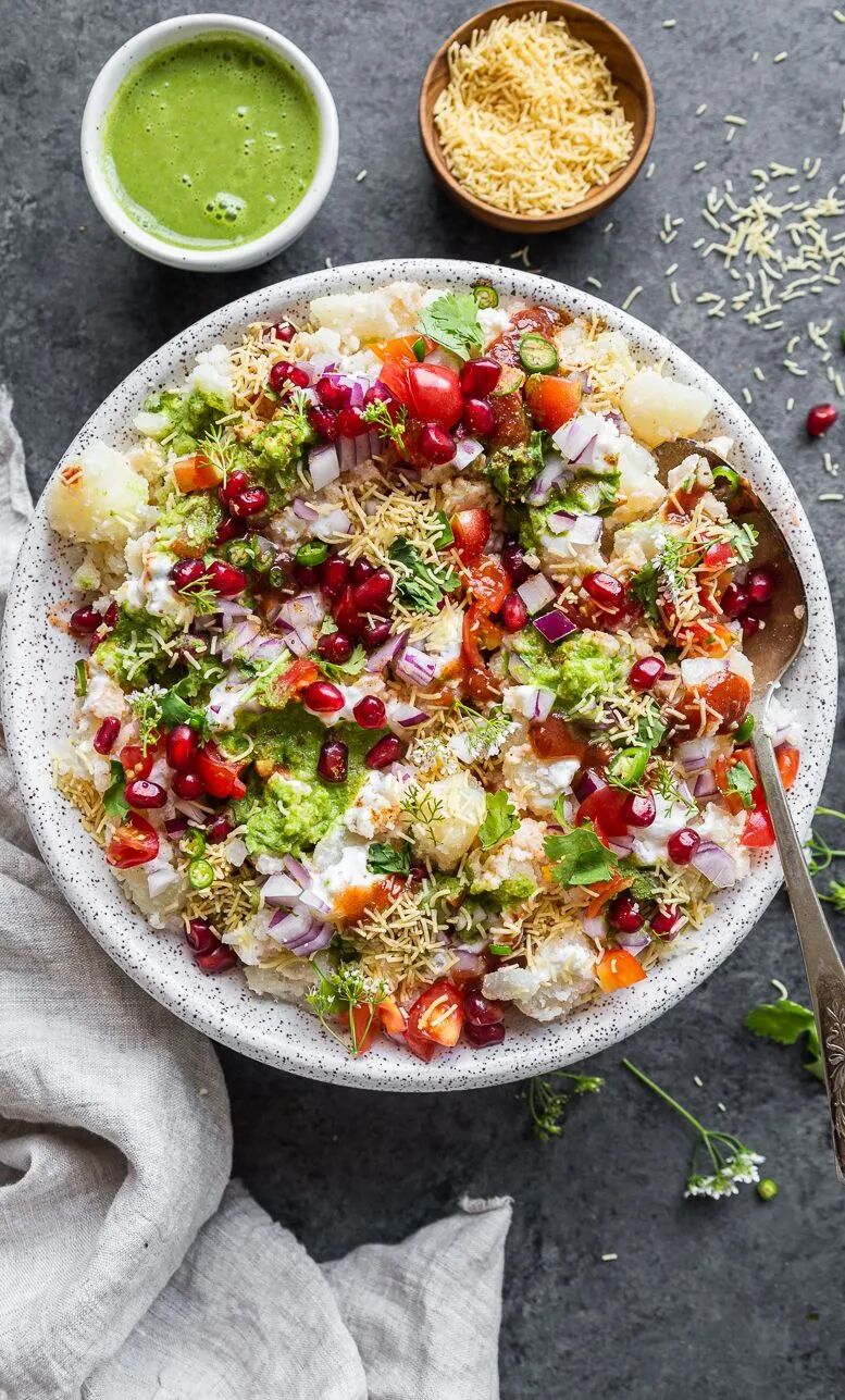 Chat is a common salty snack on the streets of India. It is rich in flavor with shortbread, potatoes and beans paired with chutney and spices.