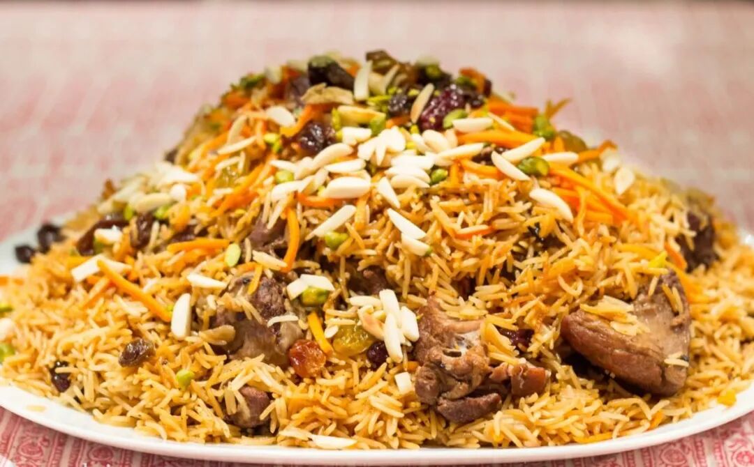 Kabul pilaf, steamed with lamb or beef with carrots, raisins and spices, is a representative festive dish in Afghanistan.