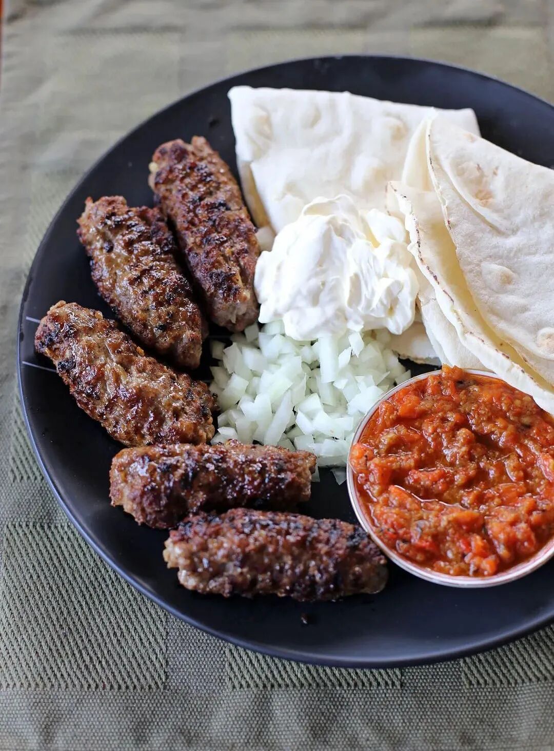 Chevapi is a common small roasted sausage in the Balkans. It is usually eaten with onions, sour cream and bread. It is a representative of street fast food.